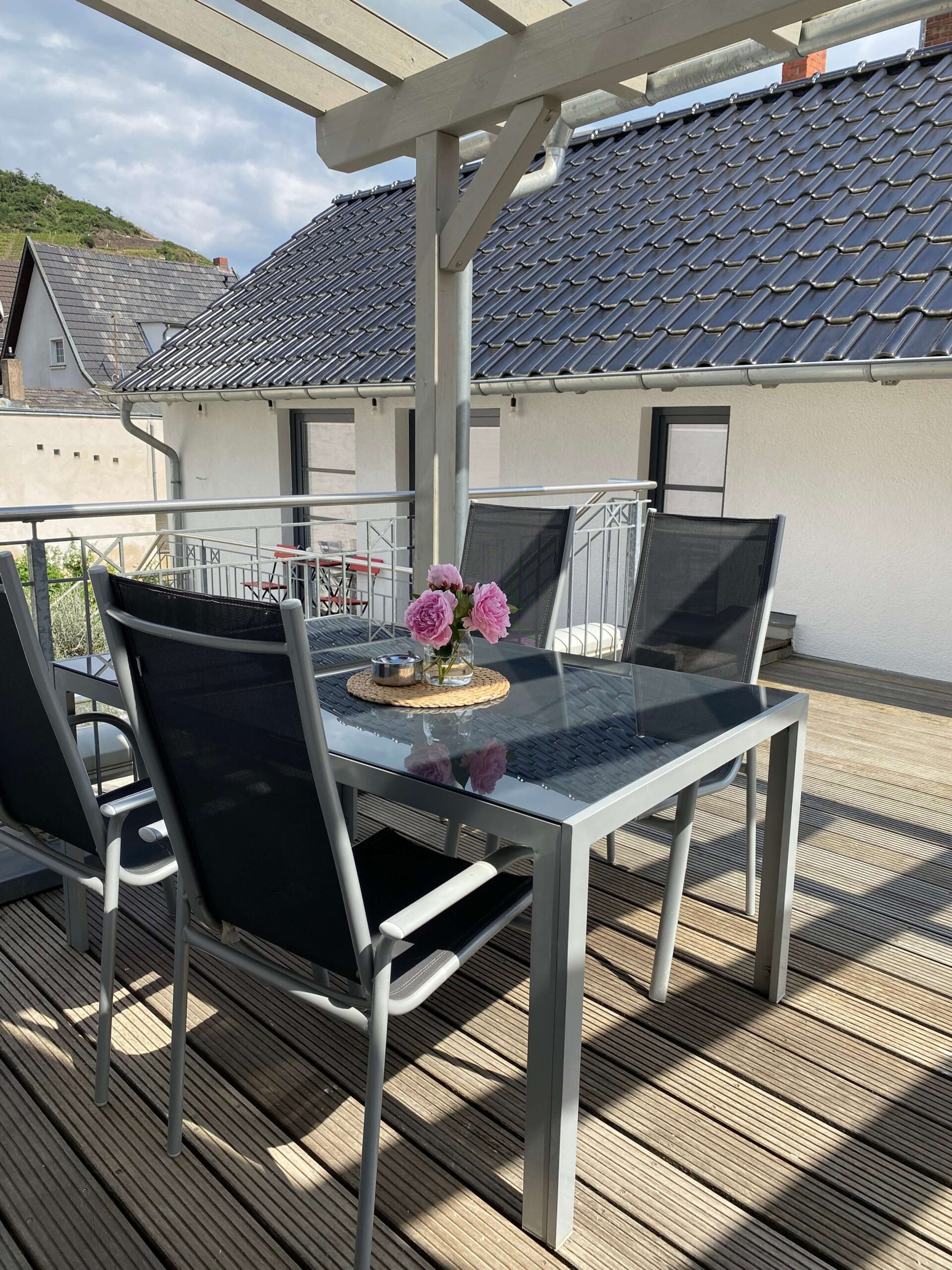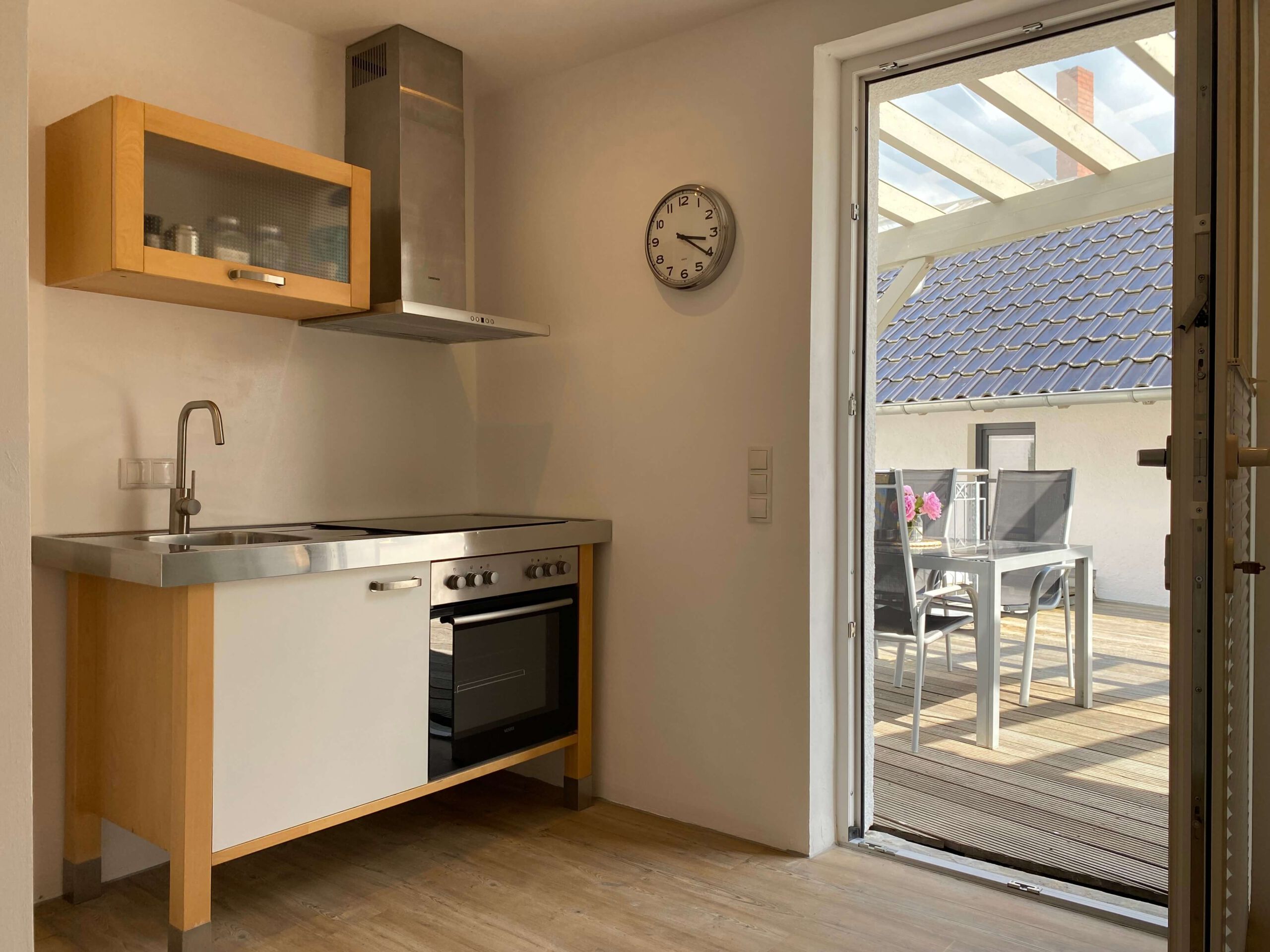 Unsere schöne ca. 45 qm große Ferienwohnung hat ein Schlafzimmer, ein Duschbad, ein Wohnzimmer mit einem Esstisch für 4 Personen und einer Schlafcouch (für zwei Personen) und eine kleine Küche mit Zugang zur überdachten Terrasse mit Sitzgelegenheiten für vier Personen.